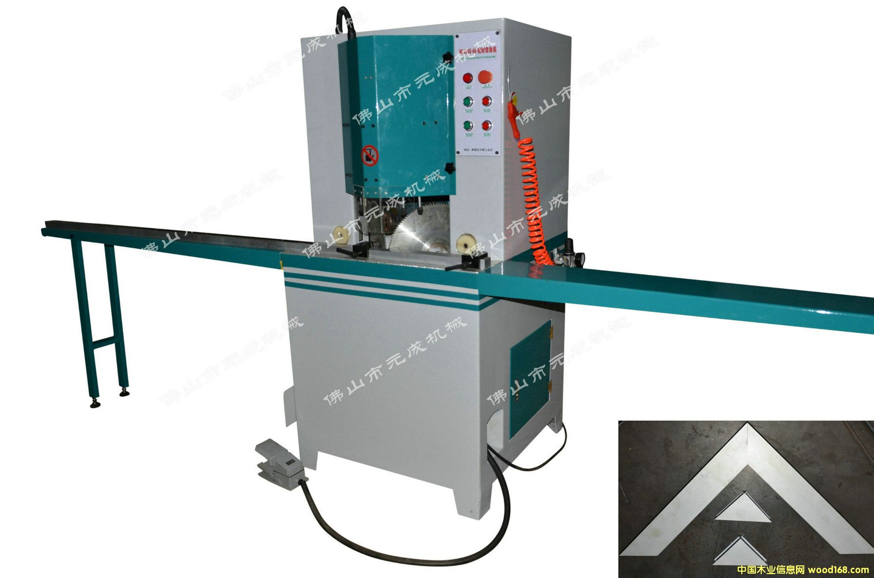 雙端45度切角機(jī) 適合45°鋸切(集成吊頂、推開門窗框、鋁相框、鏡框、展示柜、空調(diào)出風(fēng)口、燈箱、屏風(fēng)、飾條、鋁封邊、櫥柜、燈具、畫框室內(nèi)裝飾等材料……,是鋁材、木材45度斜角加工的最佳合作伙伴。 1.雙刀式同步鋸切,較一般鋸切可節(jié)省2/3時(shí)間 2.只須踩踏開關(guān),機(jī)械將自動(dòng)壓料,自動(dòng)鋸料,既安全又輕松 3. 采用雙導(dǎo)軌進(jìn)口直線線軌,鋸片上下直線運(yùn)動(dòng),鋸切速度穩(wěn)定,確保鋸片不積屑,鋸片銳利.鋸片工作時(shí)自動(dòng)噴灑冷卻水,防止鋁材粉末粘結(jié)在鉆片上,更好的保護(hù)的鋸片. 鋸切斷面光潔無毛刺,無需二次加工.高效率,是一般單頭機(jī)的3倍的產(chǎn)量. 4.上下前后均使用氣缸夾緊,材料穩(wěn)固,不變形,鋸切角度準(zhǔn)確,且可調(diào)整壓料壓力從而空心料不易變形 5 .特附有進(jìn)出料架各3米安置在機(jī)臺(tái)左右兩端,出料架設(shè)有定位擋版,便于定寸鋸切(輸送臺(tái)為鋁條托架)